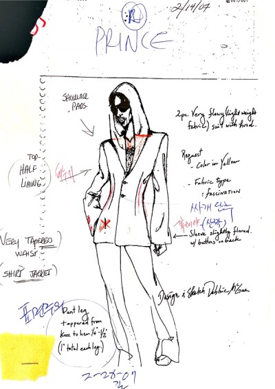 Every garment was meticulously handcrafted by our in-house team, with Prince’s inventive spirit guiding every choice. We selected fabrics that ranged from liquid silks to metallic meshes and developed custom zipper pulls, hidden snaps, and intricate hand stitching to echo the complexity of his persona. Whether we were shaping a fitted tailcoat or constructing a voluminous cape, our process always began with a conversation about what the piece needed to express.