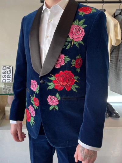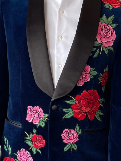 A men's bespoke two-piece blue velvet suit with floral embroidery by High Society and staychillbill.