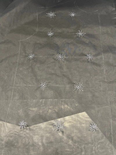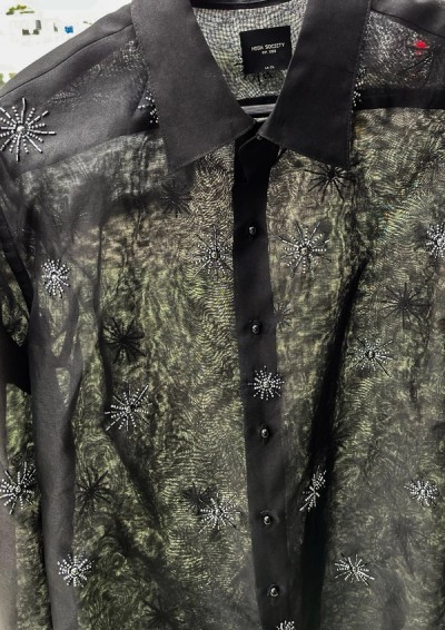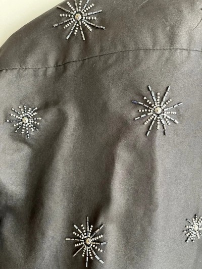 A black organza button up long sleeve with hand embroidered stars. A collaboration between stylist Gabrielle Hurwitz and High Society.